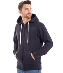 80% organic cotton/20% polyester. Organic or in-conversion to organic cotton. Soft peached fabric with brushed inner. Drop shoulder style. Lined hood with flat natural drawcord and brass effect tipping. Taped neck. Full length brass effect YKK zip. Front pouch pockets with flatlock stitching. Deep ribbed cuffs and hem. Tear out label.